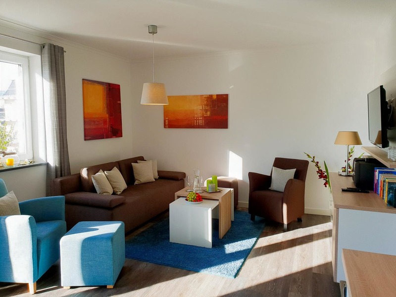 Das Wohnzimmer hat eine Schlafcouch, eine offene Küche und WLAN.