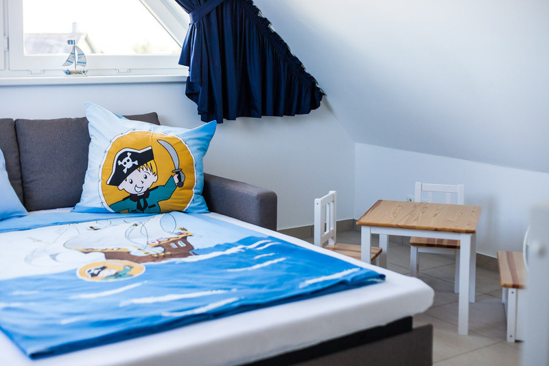 Über den Flus erreichen Sie die großzügigen kindgerechte offene Schlafgalerie in der 2. Ebene. Hier steht Ihnen eine Ausziehcouch zur Verfügung. Für unseren kleinen Gäste haben wir ein Babybett, ein Hochstuhl, Wickeltisch sowie Fläschchenwärmer.