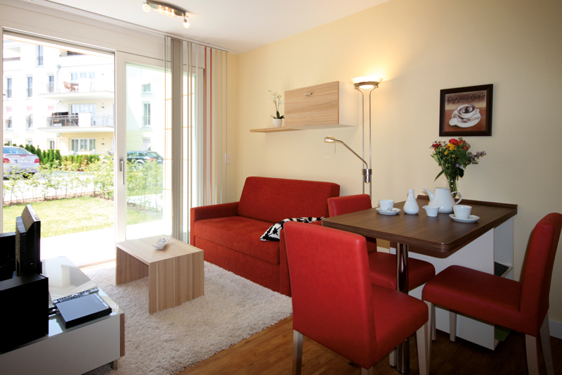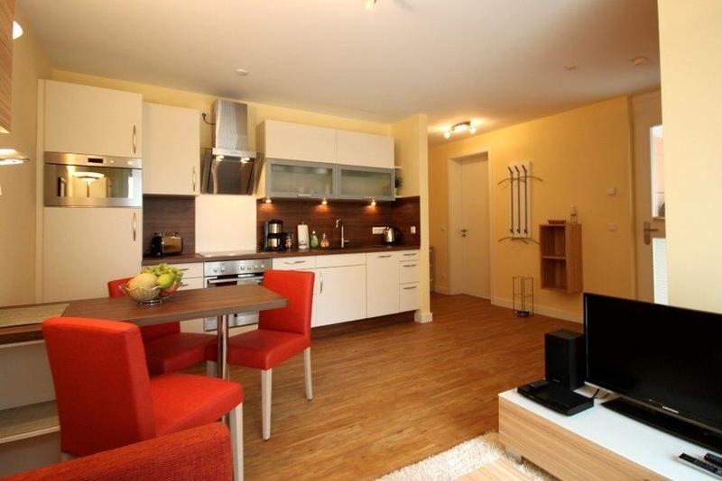 Die für zwei Erwachsene und ein Kind eingerichtete Wohnung befindet sich im Erdgeschoss der Villa Seeadler in Börgerende, nur wenige Schritte zum Strand. Die Wohnung verfügt über Fußbodenheizung und hat ein geräumiges Schlafzimmer und einen kombinierten Ess- und Wohnraum mit direktem Zugang auf die Terrasse mit Gartenanteil. Im Schlafzimmer finden Sie ein großes Doppelbett, einen geräumigen Kleiderschrank mit Spiegel und einen gemütlichen Sessel. Die komplett ausgestattete, hochwertige Küche verfügt über alles, was Sie für einen angenehmen Aufenthalt benötigen. Im Essbereich erwarten Sie ein Tisch mit Regalteil mit Abstellmöglichkeit sowie drei gemütliche Stühle. Die Couch im Wohnbereich lädt zum Ausruhen und Fernsehen ein; für ein separat buchbares Kinderreisebett ist ebenfalls genügend Platz vorhanden. Das großzügige Bad hat eine bodengleiche Dusche und einen Waschtisch mit breitem Spiegel. Auf der nach Süd-West ausgerichteten Terrasse finden Sie einen Strandkorb, der zum Liegestrandkorb ausgeklappt werden kann und einen Tisch mit zwei Stühlen. Die Wohnung selbst ist durch mehrere Schiebetürenfenster sehr hell und die Terrasse ist bis in den späten Nachmittag von der Sonne überflutet. Zur Nacht kann die gesamte Wohnung durch Außenrollläden vollständig verdunkelt werden. Zu Ihrer Wohnung gehört ein kostenfreier PKW-Stellplatz direkt am Eingang der Wohnung.
